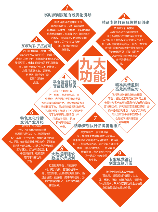 四川新闻网(www.newssc.org)由中共四川省委宣传部主管主办,于1999年1月正式上线,系全国首批省级重点新闻单位,四川省级主流媒体。网站已发展成为四川省最具影响力的综合性门户网站和重点新闻门户网站,在全省21个市州设立地方频道,提供最权威、最快捷、最全面的四川新闻和四川资讯,成为国内各大网站转载四川新闻的主要核心新闻源。